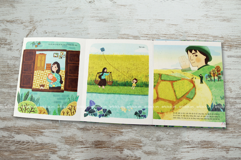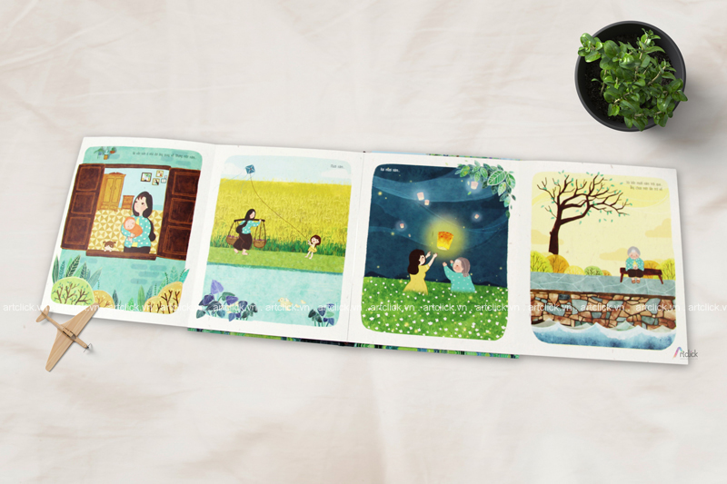 Artbook DƯỚI MÁI HIÊN NHÀ (35407) có tay gấp mở trên, kích thước album 20x25cm, trang mở trên 50x40cm
