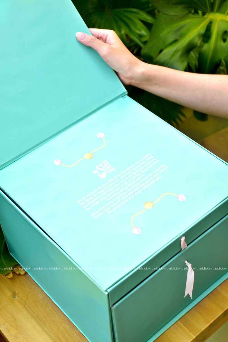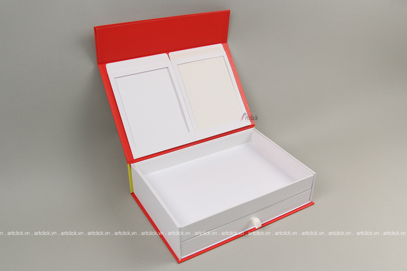 Hộp 2 tầng khoét lỗ theo yêu cầu khách (combo bộ sản phẩm bao gồm: photobook, hộp lớn 2 tầng, hộp nhỏ dạng âm dương đựng postcard) (28989). Xem video sản phẩm