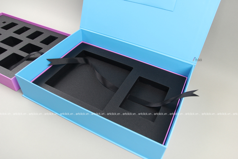 Hộp 2 tầng xếp chồng dạng nắp nam châm, tầng dưới cố định, tầng trên có thể lấy ra khoét lỗ đựng sản phẩm. Bên ngoài gắn quai xách theo yêu cầu (33645)
