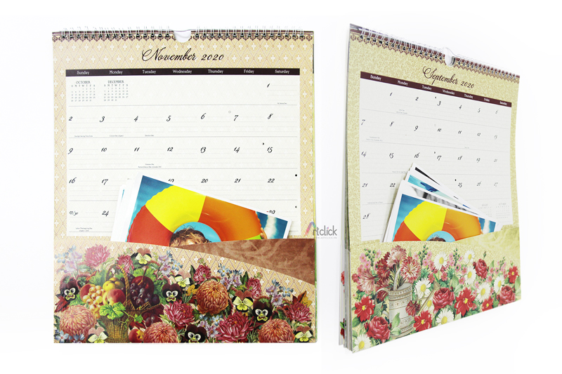 Lịch doanh nghiệp dạng lò xo giữa, hình ảnh nghệ thuật, phần dưới có túi đựng postcard hoặc thư từ..