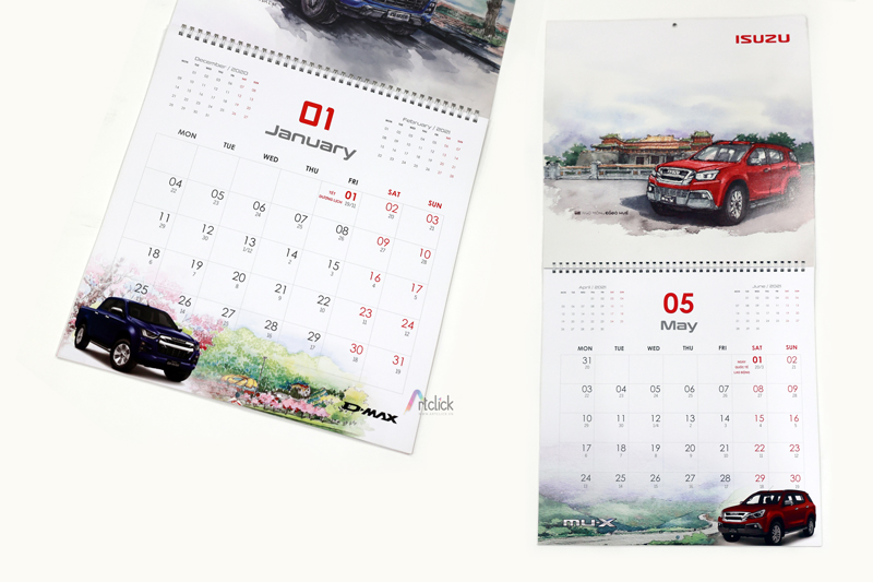 Lịch treo tường doanh nghiệp ISUZU 2020 – bấm kim giữa size 30×30 (khổ treo 30×60)