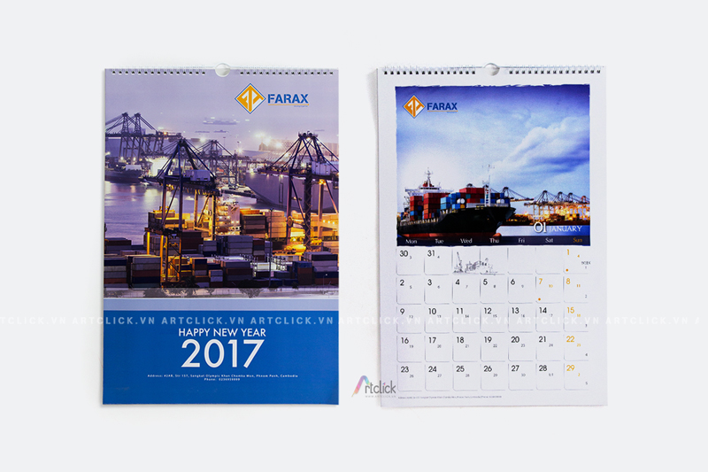 Lịch treo tường doanh nghiệp FARAX 2017 – 13 tờ lò xo trên. 1 tờ lịch bìa và 12 tờ lịch 12 tháng, kích thước thông dụng là 30x45cm.