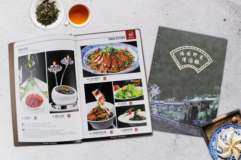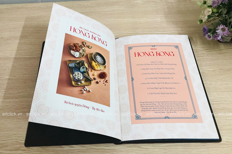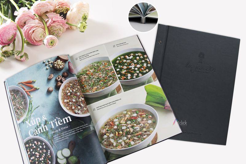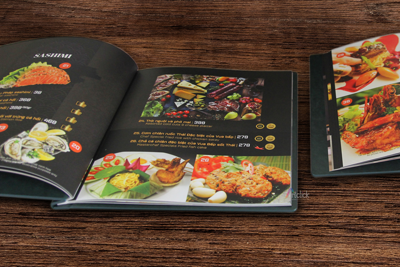 Menu cao cấp với các hiệu ứng đặc biệt như: menu bìa bọc da, bìa gắn thẻ da, bìa da in logo chìm, ép kim, dập nổi,… Hoặc cách đóng cuốn độc đáo lạ mắt như: gáy may chỉ, gáy đóng đinh,.. Artclick cung cấp dịch vụ thiết kế và in ấn chuyên nghiệp.