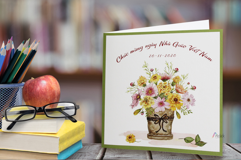 Thiệp gấp đôi in trên giấy mỹ thuật sang trọng, màu sắc nhã nhặn.