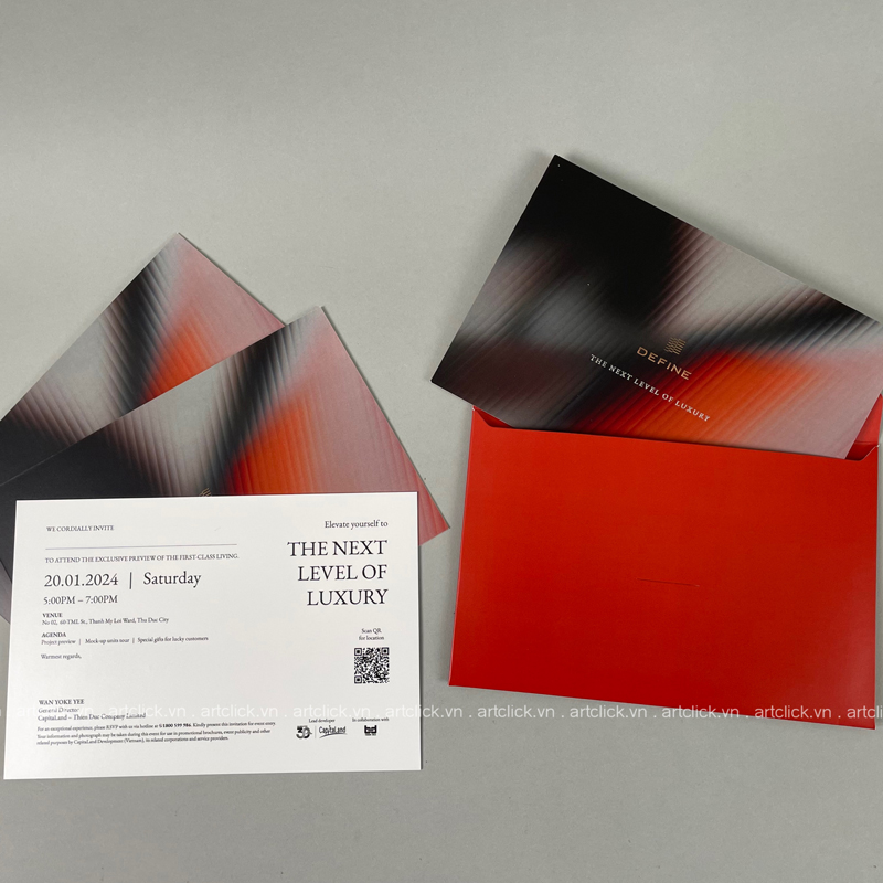 In ấn thiệp mời sự kiện là cách tuyệt vời để tạo ấn tượng ban đầu chuyên nghiệp và thu hút khách mời. Với thiết kế đa dạng và chất liệu cao cấp, thiệp mời sẽ trở thành lời mời hấp dẫn, khẳng định tầm quan trọng của sự kiện. Artclick cung cấp dịch vụ thiết kế và in ấn chuyên nghiệp.