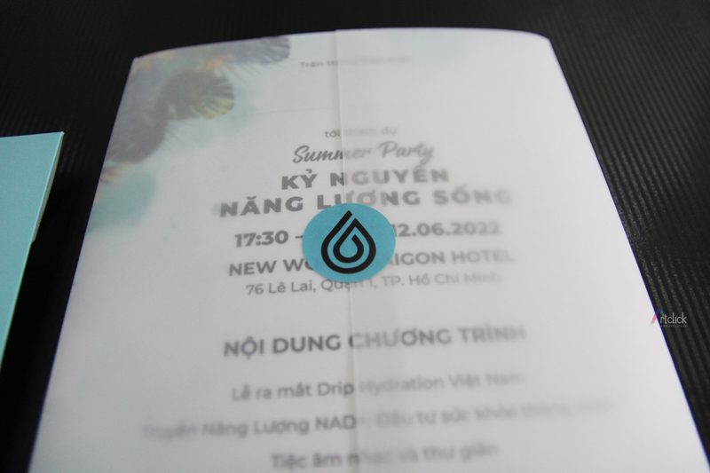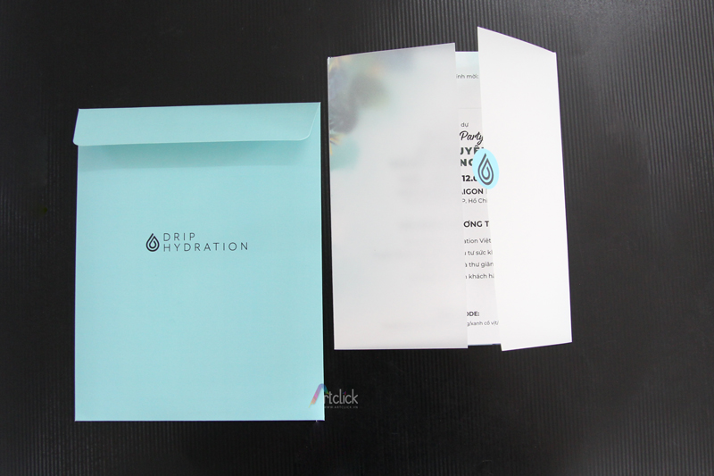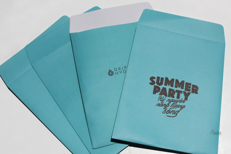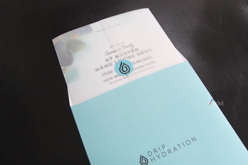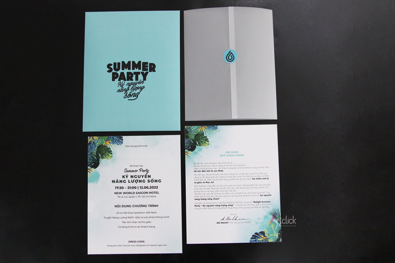 Thiệp mời Summer Party – Thiệp mời 2 tờ 2 mặt, giấy Soho, bọc ngoài giấy can. Bao thư giấy Ne. Sticker bế hình giọt nước dán trong thiệp và ngoài bao thư.