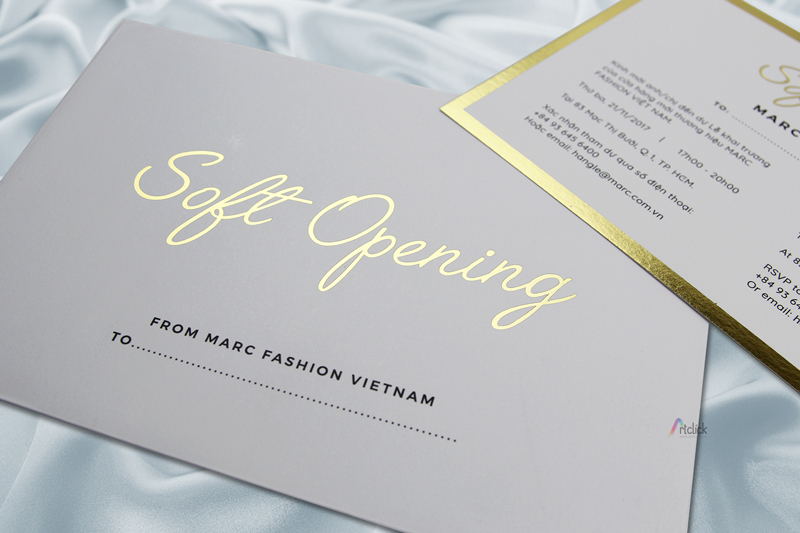 Thiệp mời khai trương cửa hàng Marc Fashion Việt Nam – in chữ ép kim, chất liệu giấy có thể ghi chữ dễ dàng