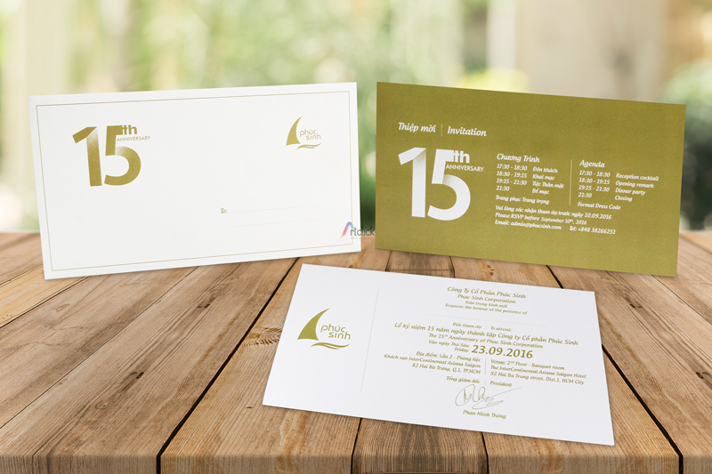 Thiệp mời tham dự Lễ kỷ niệm công ty cổ phần Phúc Sinh – ruột trong in trên chất liệu nhựa cứng và dày