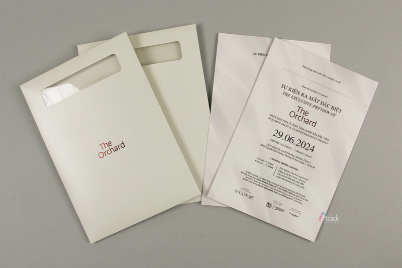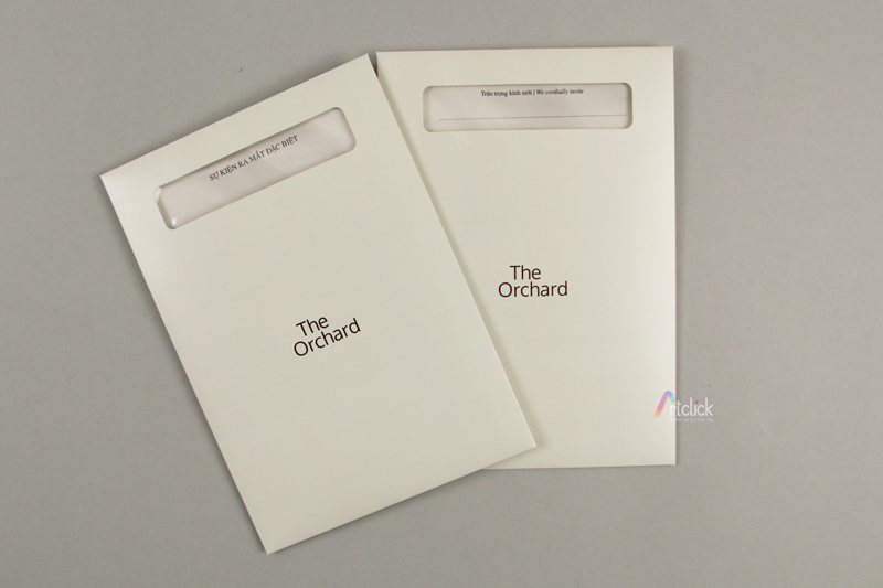 Thiệp mời ra mắt sự kiện The Orchard – bao thư in chữ ép kim, khoét lỗ thể hiện nội dung bên trong. Xem chi tiết mẫu thiệp