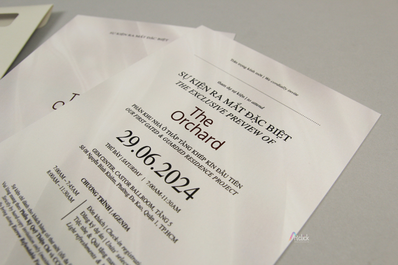Thiệp mời tham dự sự kiện chất liệu giấy mỹ thuật vân nhám nhẹ cao cấp, bồi dày cứng cáp.