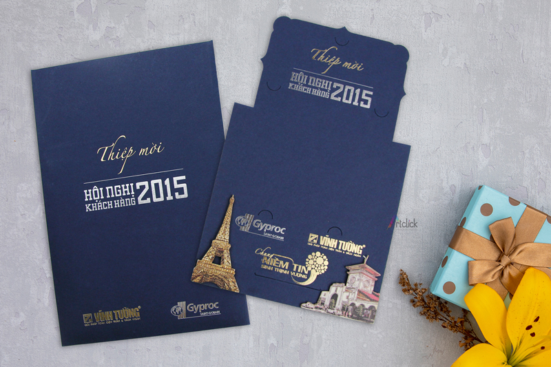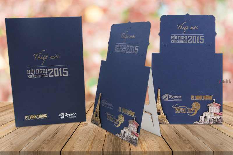 Thiệp mời Hội nghị khách hàng công ty Vĩnh Tường có chân đế sau – thiết kế đặc biệt theo yêu cầu của doanh nghiệp