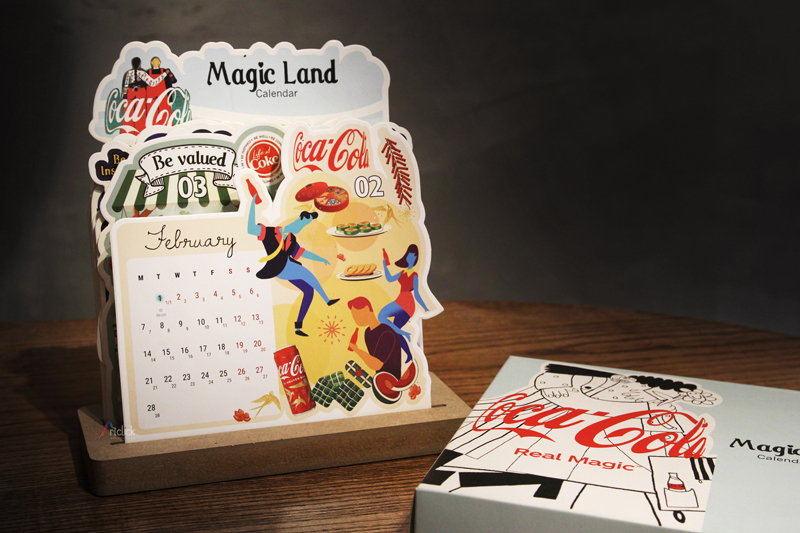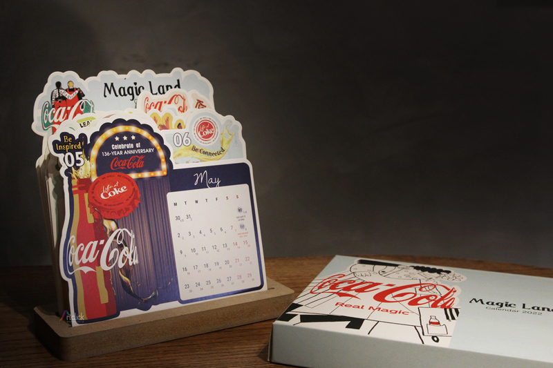 Bộ lịch Coca-Cola được bế, cắt theo hình dáng đặc biệt, mang đến một góc nhìn mới lạ và thú vị về thương hiệu đồ uống nổi tiếng này. Hình ảnh sống động, màu sắc tươi sáng, chủ đạo là đỏ, trắng, đen đặc trưng của Coca-Cola, tạo nên một không gian “Vùng đất kỳ diệu” (Magic Land) đầy hấp dẫn. Lịch được làm từ chất liệu giấy cao cấp, bền đẹp, kết hợp với đế gỗ tạo sự chắc chắn.