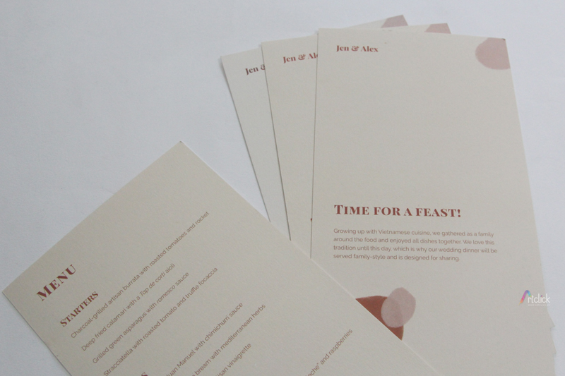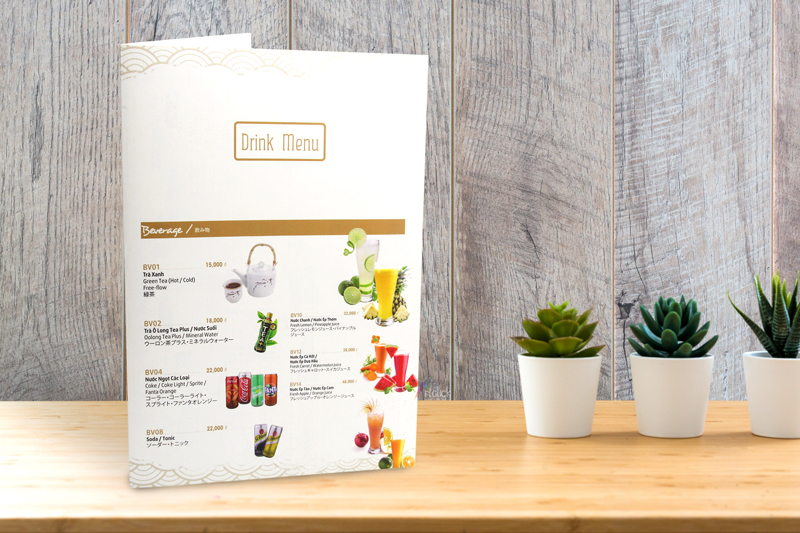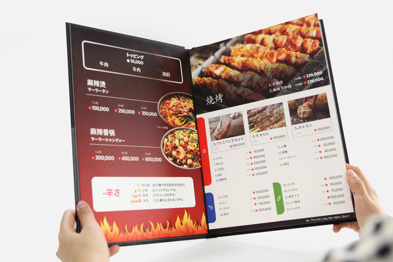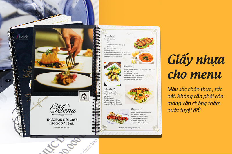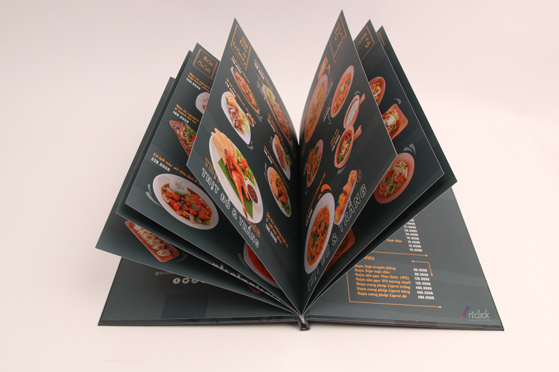 Phù hợp với những menu nhiều trang, ưu điểm giấy mỏng, nhẹ, dễ dàng mang đi. In ấn chuẩn màu, sắc nét. Tạo nên sự sang trọng và đẳng cấp cho nhà hàng, quán cafe. Xem chi tiết