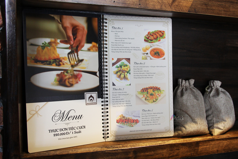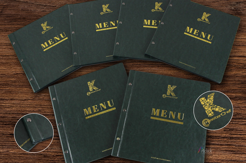 Menu cao cấp với các hiệu ứng đặc biệt như: menu bìa bọc da, bìa gắn thẻ da, bìa da in logo chìm, ép kim, dập nổi,… Hoặc cách đóng cuốn độc đáo lạ mắt như: gáy may chỉ, gáy đóng đinh,.. Xem chi tiết