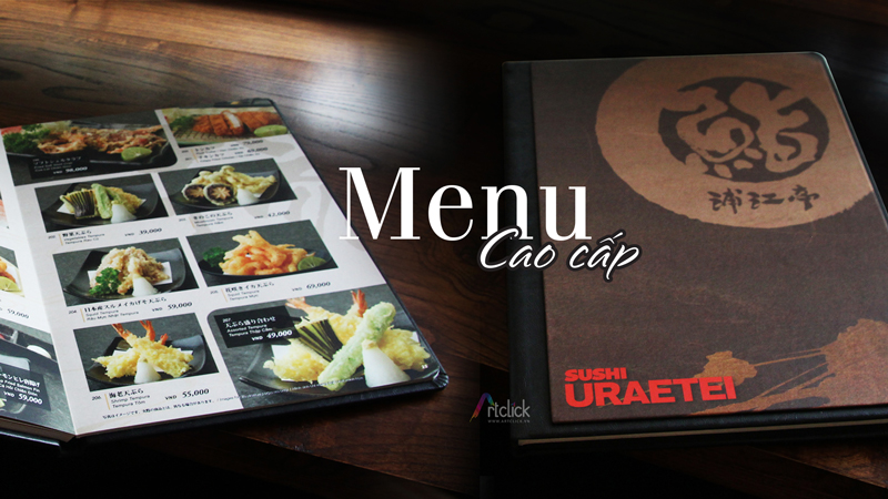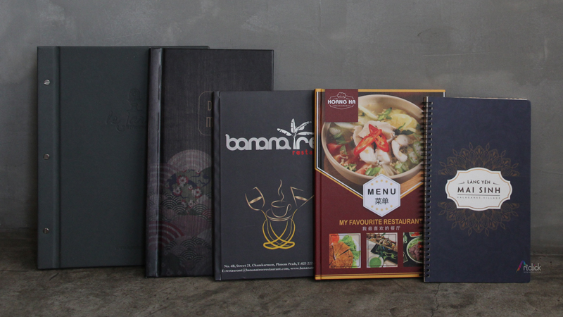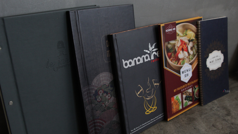 Menu cao cấp với các hiệu ứng đặc biệt như: menu bìa bọc da, bìa gắn thẻ da, bìa da in logo chìm, ép kim, dập nổi,… Hoặc cách đóng cuốn độc đáo lạ mắt như: gáy may chỉ, gáy đóng đinh,.. Xem chi tiết