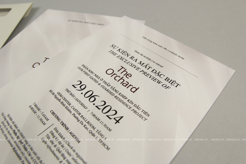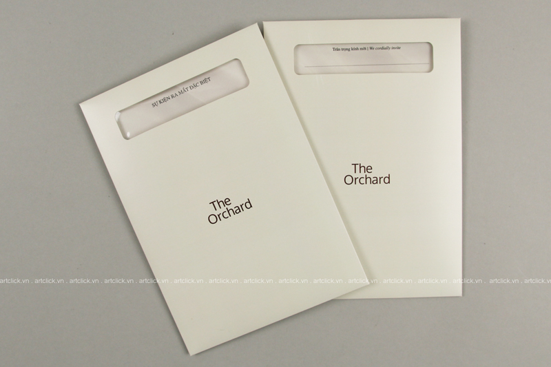 Để minh chứng cho những tuyệt chiêu trên, hãy cùng nhìn vào cách Artclick – chuyên gia in ấn cá nhân hóa, đã hợp tác cùng The Orchard (Dự án Bất động sản cao cấp) để tạo nên mẫu thiệp mời sự kiện đẹp độc đáo cho buổi ra mắt phân khu nhà ở thấp tầng khép kín đầu tiên của họ.